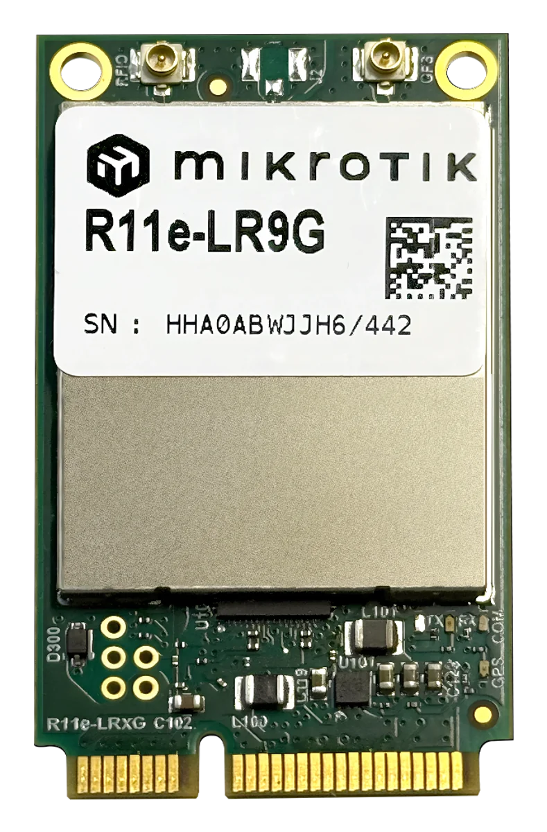 The R11e-LR9G is a next-generation concentrator card for 915 MHz LoRa® networks, compatible with any MikroTik device that has a miniPCIe slot and USB lines.