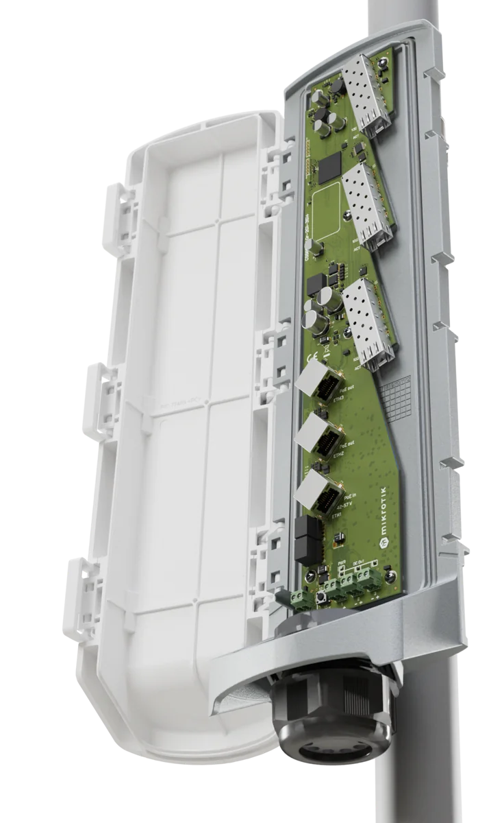 A remarkable outdoor switch for setting up an optical 10G network that can even perform some light routing. The spiritual successor to the beloved FiberBox. Gigabit Ethernet, SFP/SFP+, PoE.